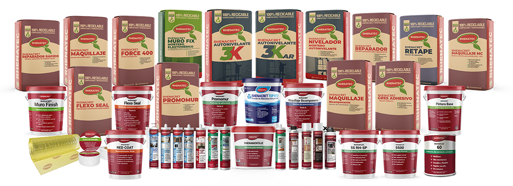 Actualmente nuestra gama de productos Rhenatec comprende las categorías de Morteros Técnicos, Sistema EIFS, Adhesivos, Sellantes, Espumas de PU, Siliconas, Aditivos, Impermeabilizantes,Revestimientos, Herramientas, Accesorios, entre las principales.